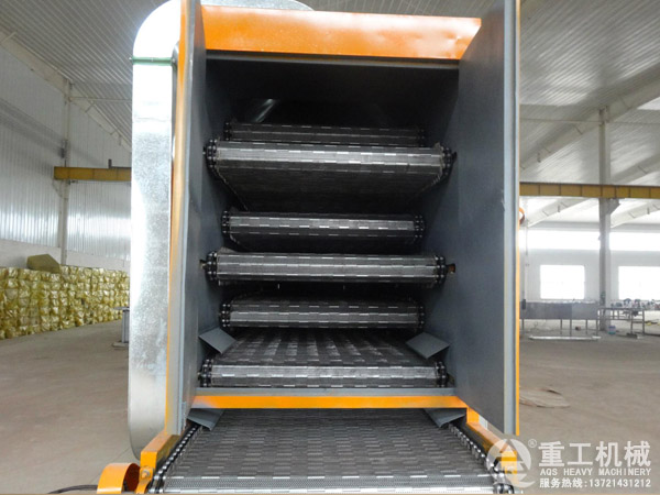 網(wǎng)帶式烘干機是一種批量、連續(xù)式生產(chǎn)的干燥設備,主要加熱方式有電加熱、蒸汽加熱、熱風加熱。其主要原理是將物料均勻的平鋪在網(wǎng)帶上,網(wǎng)帶采用12-60目的鋼絲網(wǎng)帶,由傳動裝置拖動在干燥機內(nèi)往返移動,熱風在物料間穿流而過,水蒸氣從排濕孔中排出,從而達到干燥的目的,箱體長度由標準段組合而成,為了節(jié)約場地,可將烘干機制成多層式,常見的有二室三層、二室五層、長度6-40m,有效寬度0.6-3.0m。